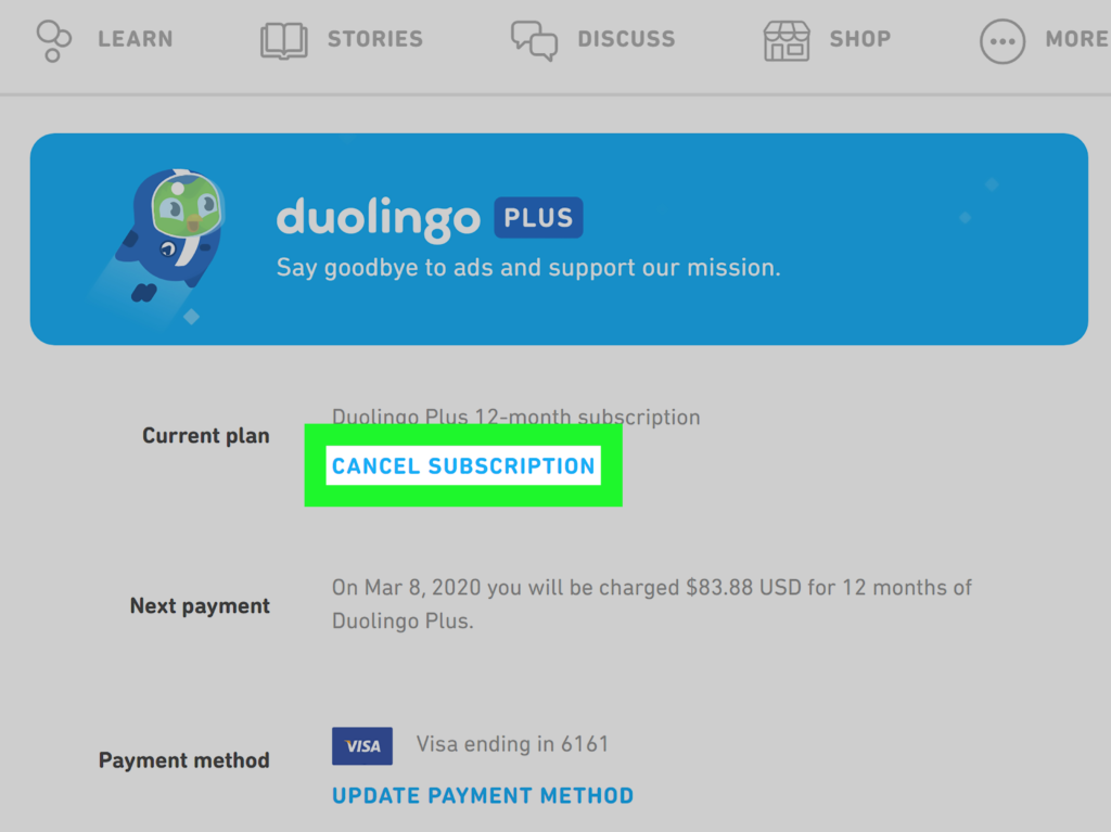 If you’ve subscribed to Duolingo Plus or any other premium features, you can cancel the recurring payment directly from your account settings: